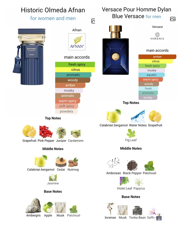 از نظر ساختار و فضا، Historic Olmeda شباهتهایی به Versace Pour Homme Dylan Blue دارد، اما تفاوتهای مهمی هم دیده میشود: