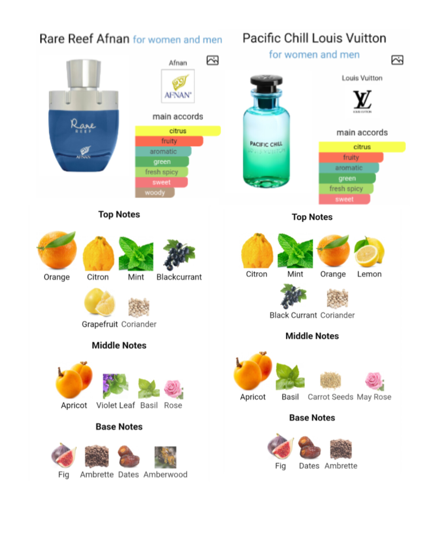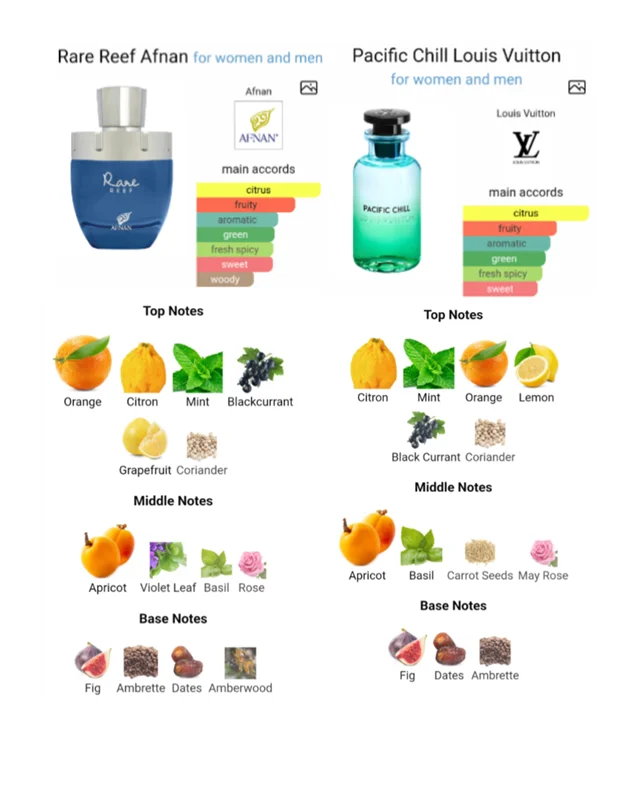 🔷 Rare Reef (Afnan):انرژیبخشتر و میوهایتر است.با اضافهشدن انگور سیاه، زردآلو و خرما، رایحه عمق شیرینتری پیدا کرده.نسبت به Pacific Chill، کمی گرمتر و مدرنتر است.